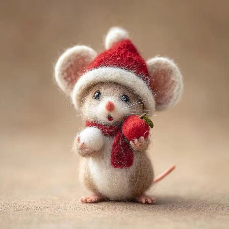 🐭 Wearing a tiny Santa hat, a mini scarf, and holding a cute red apple, this festive little mouse brings heart-melting cheer to any Christmas scene. The handcrafted details make it a delightful keepsake that radiates handmade warmth.